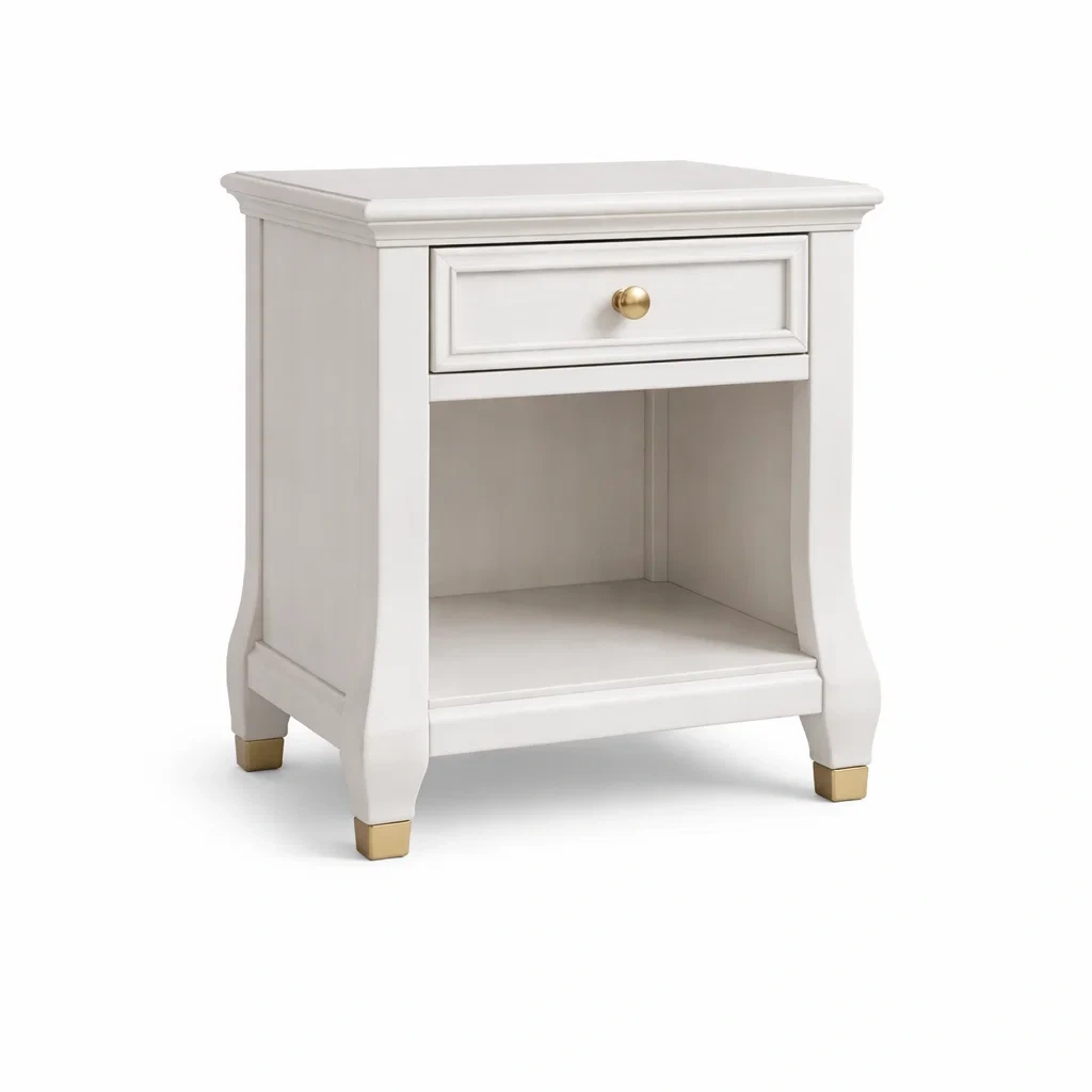Cette table de chevet est fabriquée en bois massif avec une finition peinture blanche. Elle dispose d'un tiroir avec une poignée en métal doré et d'une étagère inférieure pour le rangement.